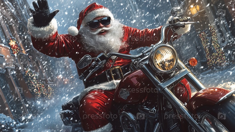Санта на мотоцикле едет по заснеженному рождественскому пейзажу