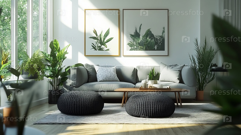 В этой уютной минималистской гостиной есть вязаный пуф, мягкие подушки и зеленые растения, которые создают спокойное и современное пространство, наполненное естественным светом