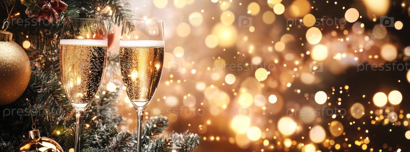 Праздничное изображение двух бокалов шампанского рядом с украшенной рождественской елкой, вызывающее радость и тепло в преддверии Нового года