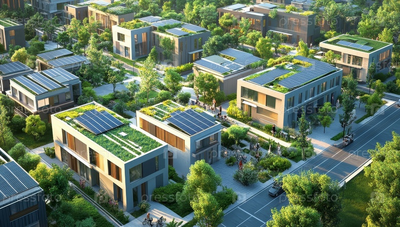 Эта яркая иллюстрация демонстрирует современный городской пейзаж с солнечными панелями, пышными деревьями и велосипедом, символизирующим экологичную городскую жизнь