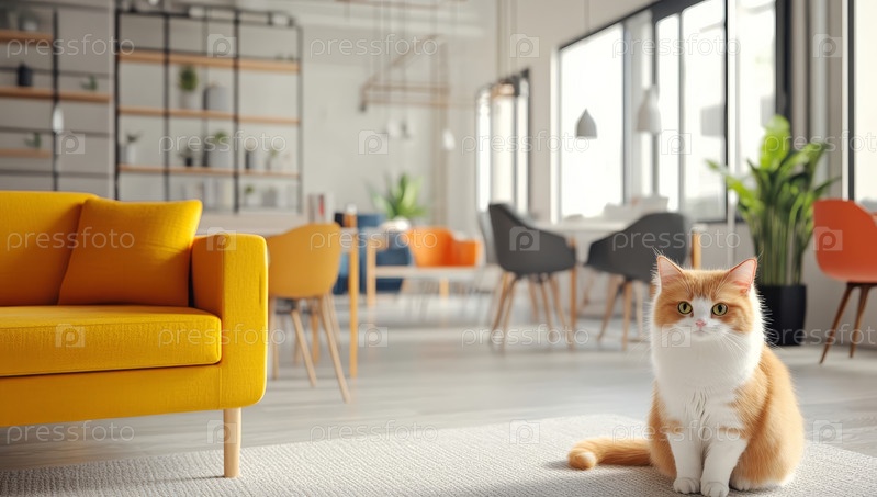 Уютный кот в современном интерьере гостиной, залитой солнцем