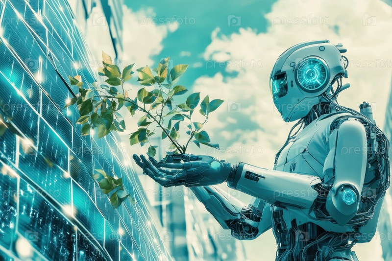 Футуристический робот-садовник ухаживает за пышной зеленью в городских условиях