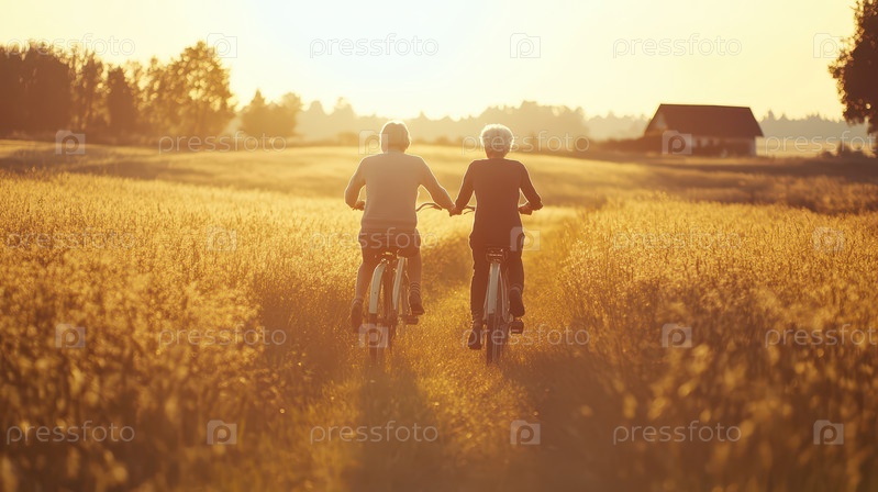 Пожилая пара катается на велосипедах по живописной сельской местности осенью