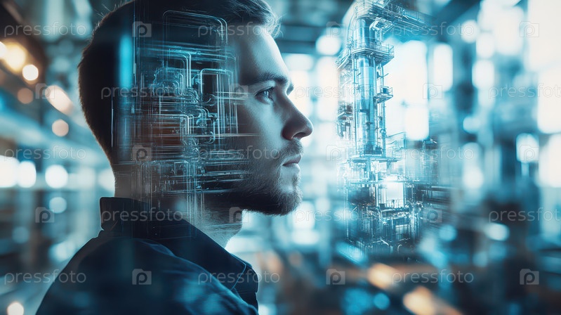 Футуристическая двойная экспозиция, демонстрирующая профиль инженера на фоне сложных промышленных трубопроводов и конструкций, символизирующих технологии, промышленность и инновации