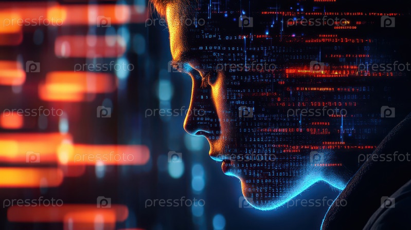 Лицо мужчины с двоичным кодом и неоновым светом