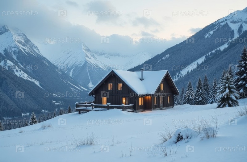 Дом заснеженные горы зима, коттедж в снегу горнолыжный курорт, гора. Сгенерировано ИИ