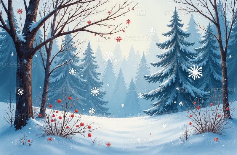 Зимний лесной пейзаж, светит солнце, деревья стоят в снегу. Сгенерировано ИИ