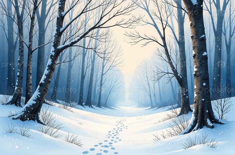 Зимний лесной пейзаж, светит солнце, деревья стоят в снегу. Сгенерировано ИИ