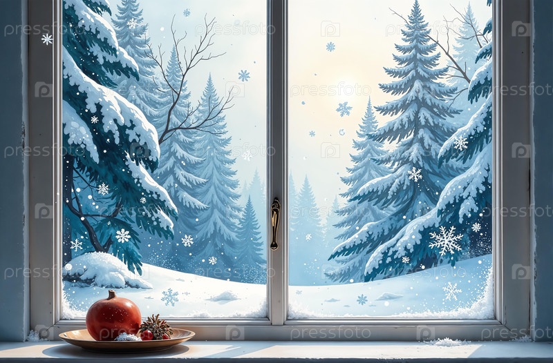 Подоконник внутри дома, за окном зима, новогодняя елка. Создано с помощью искусственного интеллекта