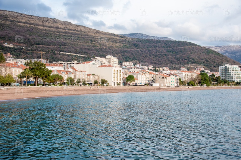 Жилые городские здания, городской пейзаж, современная панорама центра города, Петровац, Черногория
