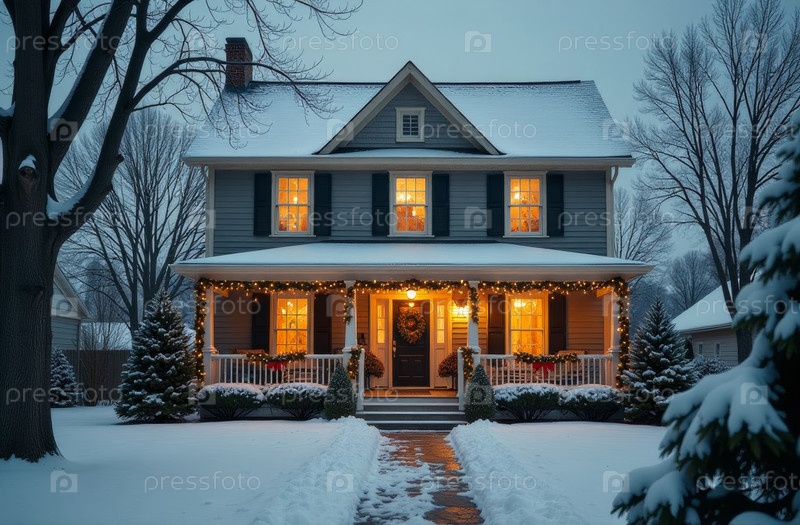 Фасад дома, вечер, снежная зима, рождественская гирлянда, канун Нового года. Создано с помощью искусственного интеллекта