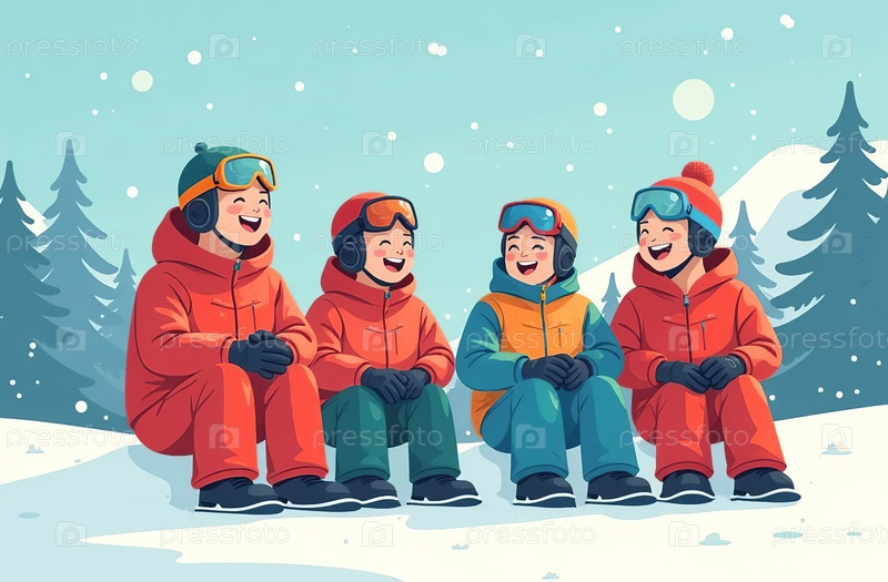Группа сноубордистов сидит на снегу в горнолыжных костюмах и смеется. Сгенерировано ИИ