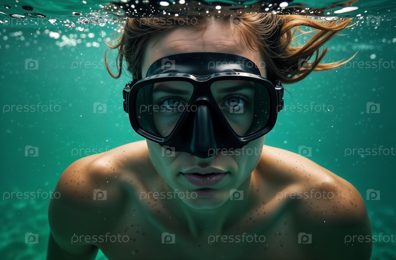 Дайвер в маске плавает под водой моря, активный отдых на океане. Генеративный ИИ