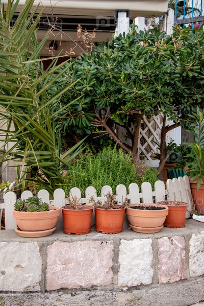 Комнатные растения в красных горшках, стоящие снаружи, милый декор кофейни