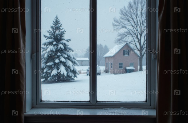 Подоконник внутри дома, за окном зима, новогодняя елка. Создано с помощью искусственного интеллекта
