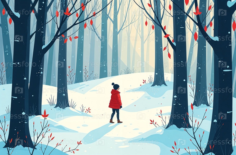 Портрет девушки, зимний лес, новогодний снегопад, дерево и горы. Создано ИИ