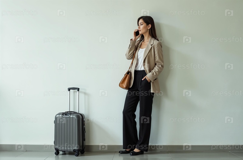 Женщина аэропорт разговор телефон, багаж чемодан колесо стойка белая стена. Генеративный искусственный интеллект