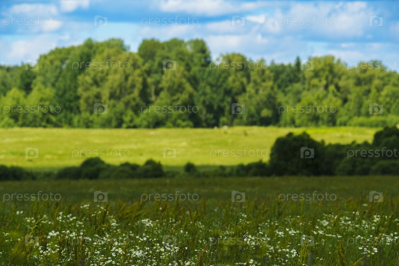 Пышная зеленая опушка леса с полевыми цветами на переднем плане