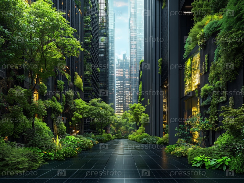 Зеленый городской коридор с пышной растительностью между современными небоскребами