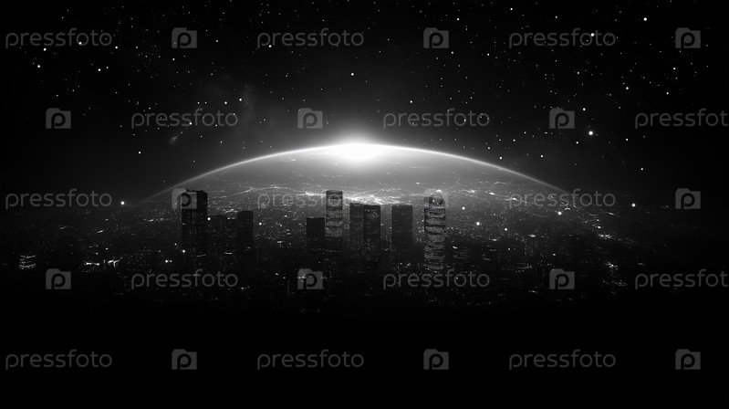 Футуристический городской пейзаж под светящимся изогнутым горизонтом и звездным небом