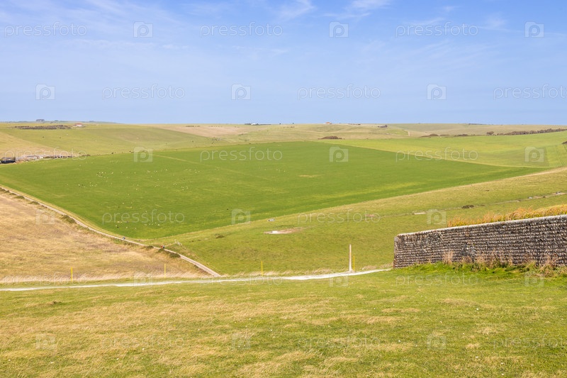 Живописный сельский пейзаж с зелеными холмами и открытыми лугами под голубым небом