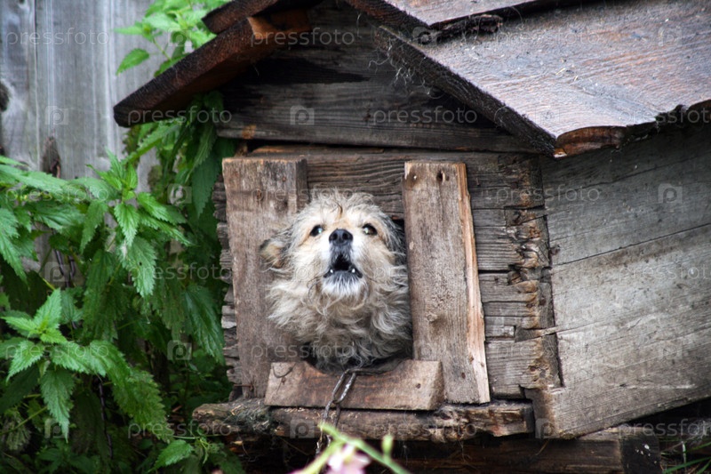 Сторож двора. Лохматая собака, выглядывающая из старой деревянной будки