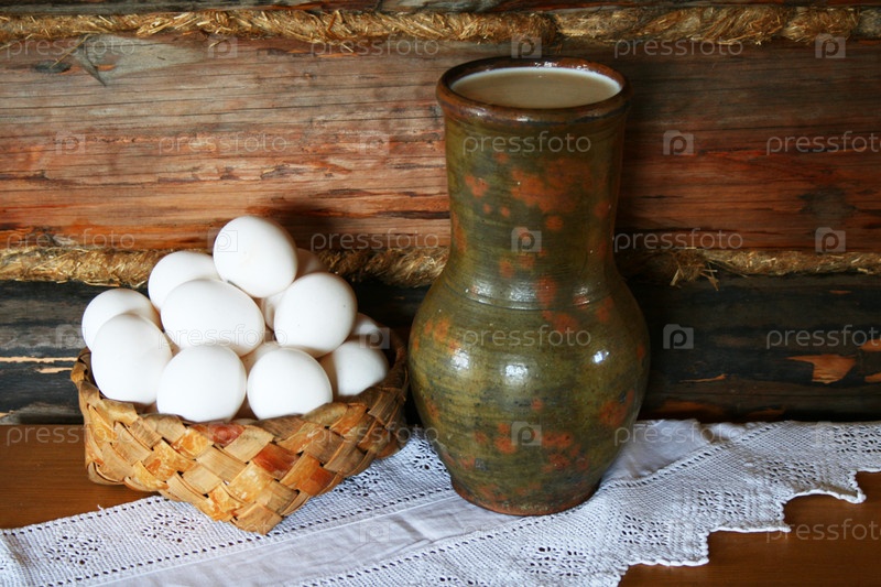 Деревенский натюрморт с яйцами и керамическим кувшином с молоком