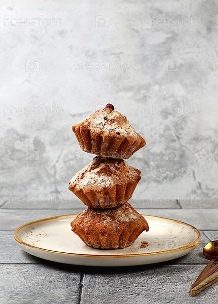 Вкусные банановые кексы с какао на бетонном кухонном столе, здоровое диетическое питание. Рекламная карточка или меню для кафе, ресторана. Концепция современной пекарни, селективный фокус