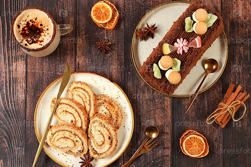 Концепция современной пекарни, праздничное угощение. Домашний вкусный тирамису, бисквит или торт со сладким джемом, кремом, орехами, корицей и молочным напитком гоголь-моголь с какао. И реклама для кафе и ресторана,
