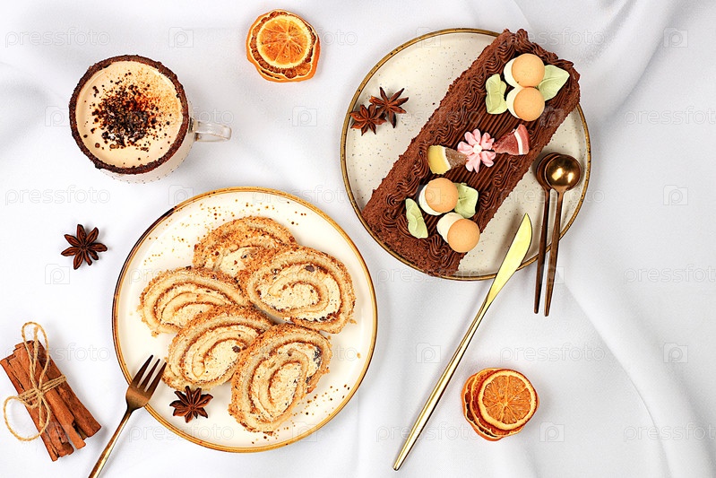Концепция современной пекарни, праздничное угощение. Домашний вкусный тирамису, бисквит или торт со сладким джемом, кремом, орехами, корицей и молочным напитком гоголь-моголь с какао. И реклама для кафе и ресторана,