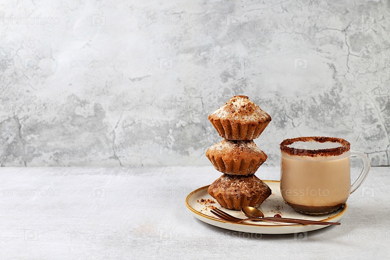 Вкусные шоколадные кексы с клюквой и молочным напитком гоголь-моголь с какао на сером кухонном столе. Рекламная карточка или меню для кафе, ресторана. Концепция современной пекарни, селективный фокус