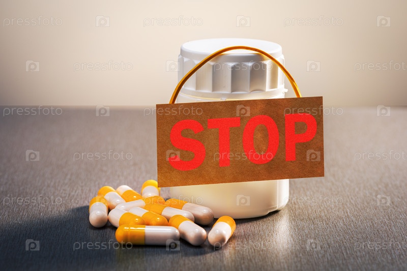 Разбросанные таблетки вокруг бутылки и знака «Стоп»