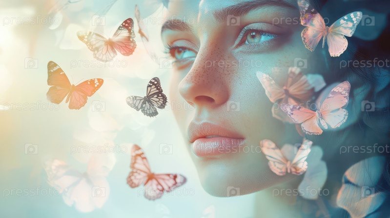 Мечтательное женское лицо с порхающими бабочками