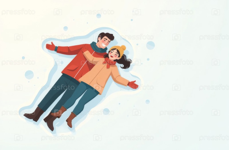 Мужчина и женщина лепят снежных ангелов, пара лежит в снегу, идет снег. Создано с помощью искусственного интеллекта