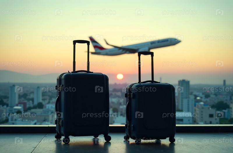 Два чемодана стоят в аэропорту, самолет взлетает, ждут отправления. Генеративный искусственный интеллект