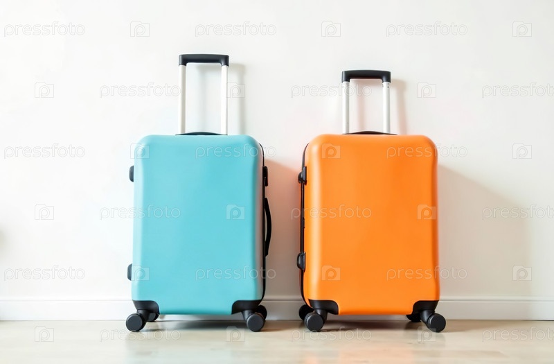 Два чемодана на колесах на фоне белой стены, отпуск. Генеративный искусственный интеллект