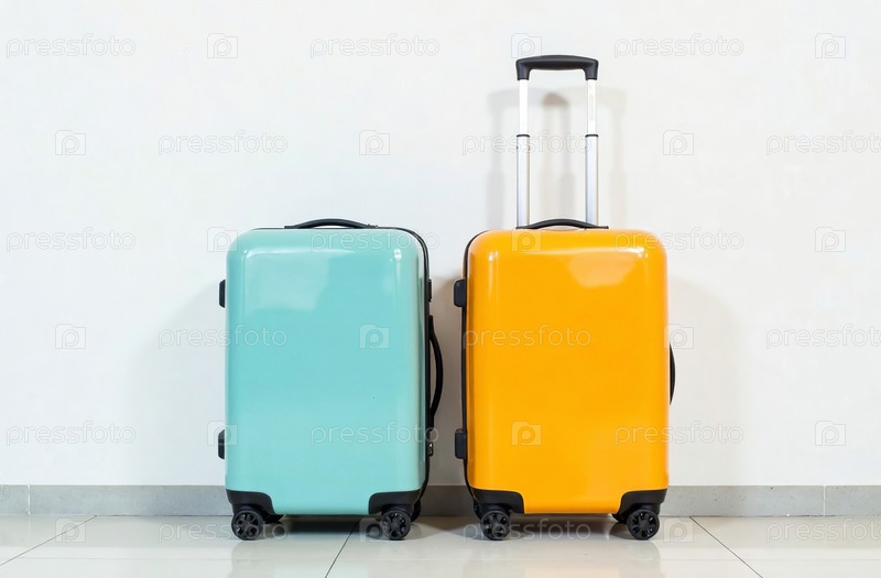 Два чемодана на колесах на фоне белой стены, отпуск. Генеративный искусственный интеллект
