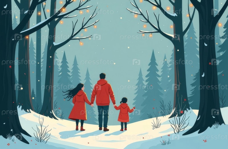 Семейный зимний лес, женщина, мужчина, ребенок, пешеходная тропа, рождественская елка. Сгенерировано ИИ
