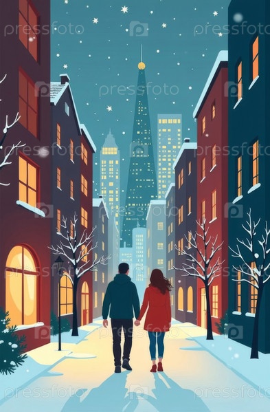 Мужчина и женщина гуляют по зимнему городу, пара гуляет по заснеженной улице, вечер. Создано искусственным интеллектом