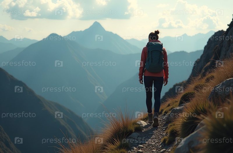 Женщина, путешествующая туристом в горах. Активный отдых на природе. Генеративный искусственный интеллект