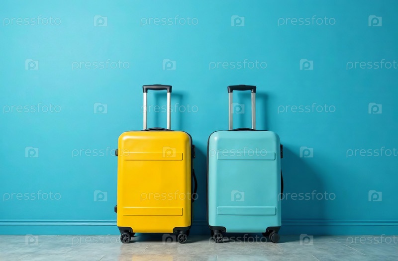 Два чемодана на колесах на фоне синей стены, отпуск. Генеративный искусственный интеллект