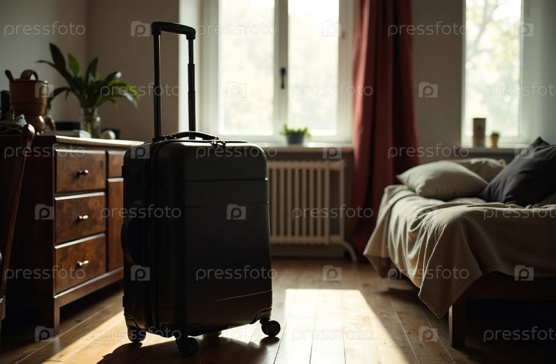 Чемодан, упакованный для поездки, стоит в квартире, интерьер спальни. Генеративный искусственный интеллект