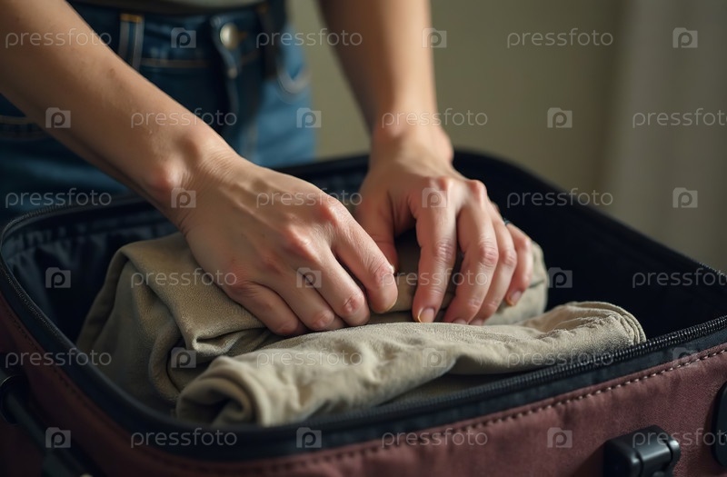 Человек пакует чемодан для поездки, одежда в багаже. Генеративный искусственный интеллект