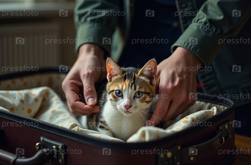 Мужчина пакует чемодан для поездки, милый домашний кот лежит в багаже. Генеративный искусственный интеллект