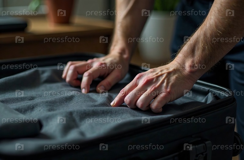 Человек пакует чемодан для поездки, одежда в багаже. Генеративный искусственный интеллект