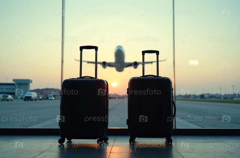 Два чемодана стоят в аэропорту, самолет взлетает, ждут отправления. Генеративный искусственный интеллект