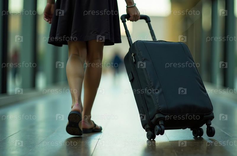 Женщина катит багаж чемодан на колесах аэропорт, отправление в путешествие. Генеративный искусственный интеллект
