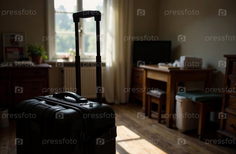 Чемодан, упакованный для поездки, стоит в квартире, интерьер спальни. Генеративный искусственный интеллект