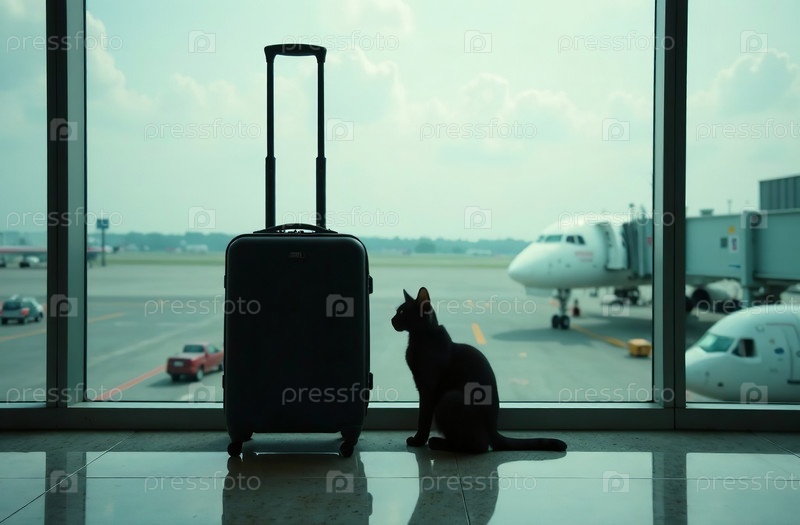 Кот сидит на чемодане в аэропорту, питомец ждет отправления самолета. Генеративный искусственный интеллект