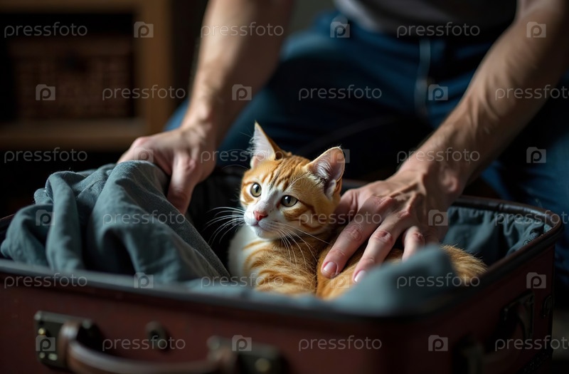 Мужчина пакует чемодан для поездки, милый домашний кот лежит в багаже. Генеративный искусственный интеллект